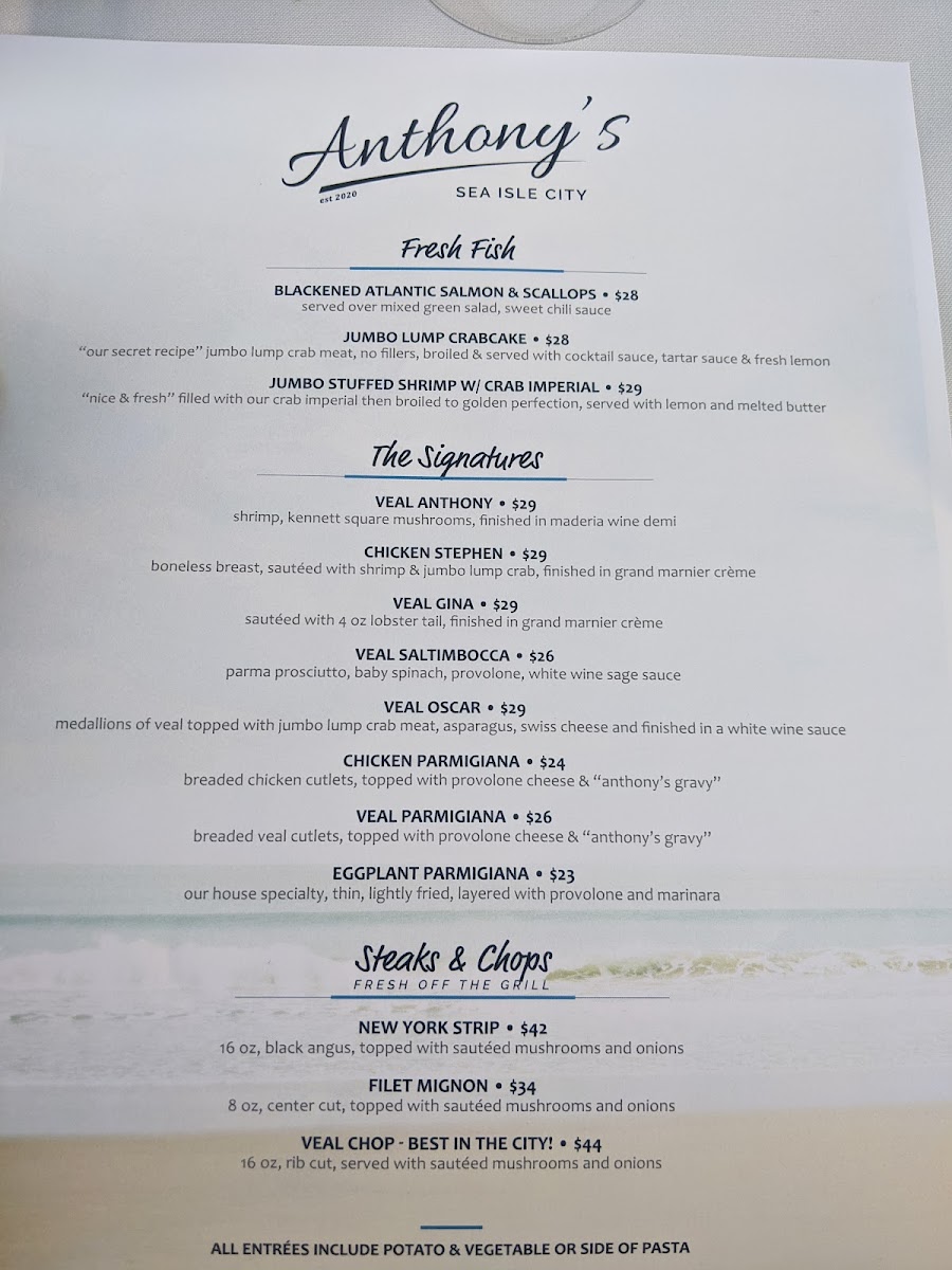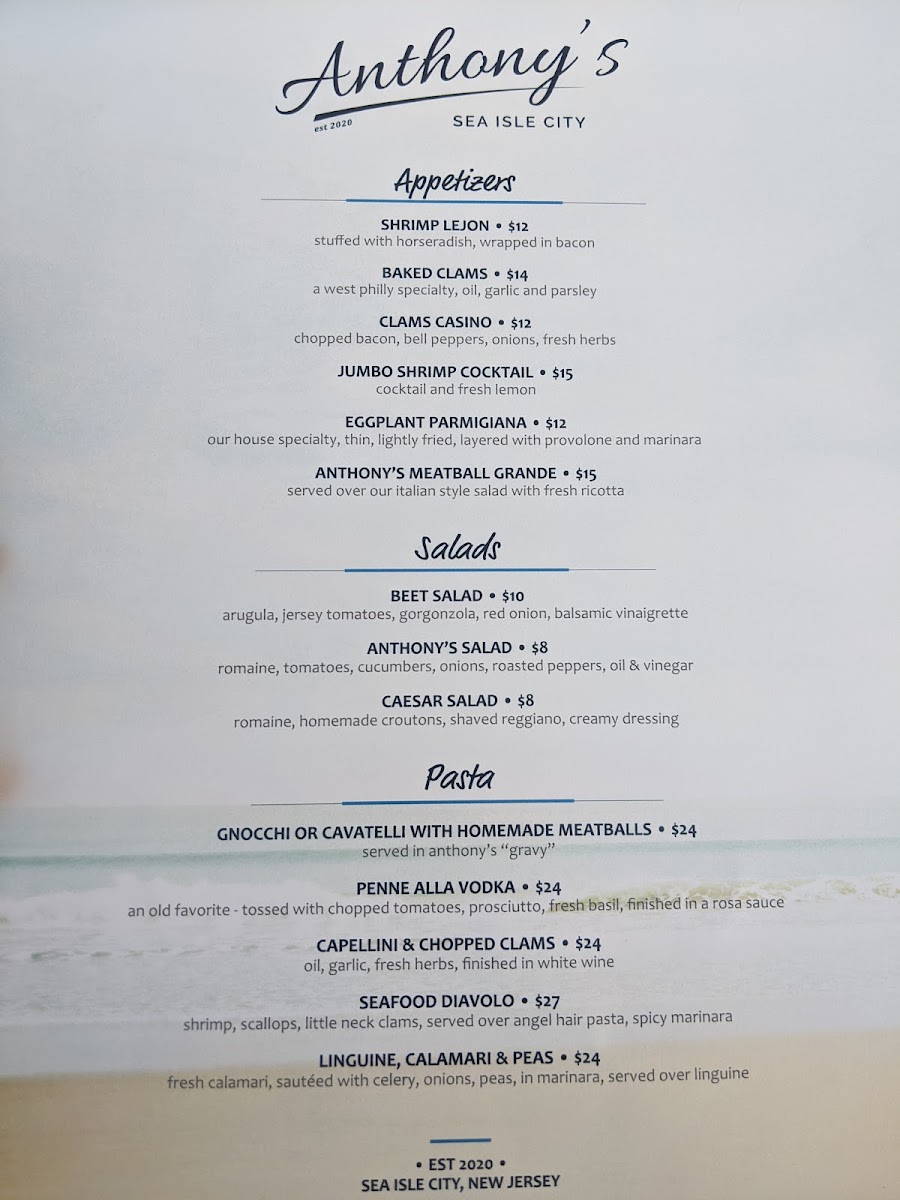 Anthony's Sea Isle City offers a diverse and appetizing menu, with standout dishes that are sure to impress. The Peach Caprese Salad is a refreshing start, combining the sweetness of ripe peaches with fresh mozzarella and basil, creating a unique twist on the classic Caprese. Another highlight is the crispy and flavorful Fried Tomatoes, perfect for those craving something savory with a bit of crunch. For pasta lovers, the Penne a La Vodka delivers a creamy and satisfying experience, while the Jumbo Lump Crab and Shrimp brings together the best of both worlds, offering a fresh and indulgent seafood dish. The Meatball Salad with Ricotta offers a hearty and savory combination, pairing tender meatballs with creamy ricotta for a filling and delicious option. Finally, the Jumbo Shrimp Cocktail is a classic appetizer that stands out with its plump, perfectly cooked shrimp, served chilled and ready to enjoy. Each dish on the menu reflects Anthony's commitment to quality, making it a must-visit spot in Sea Isle City for anyone looking to enjoy a flavorful and satisfying meal.